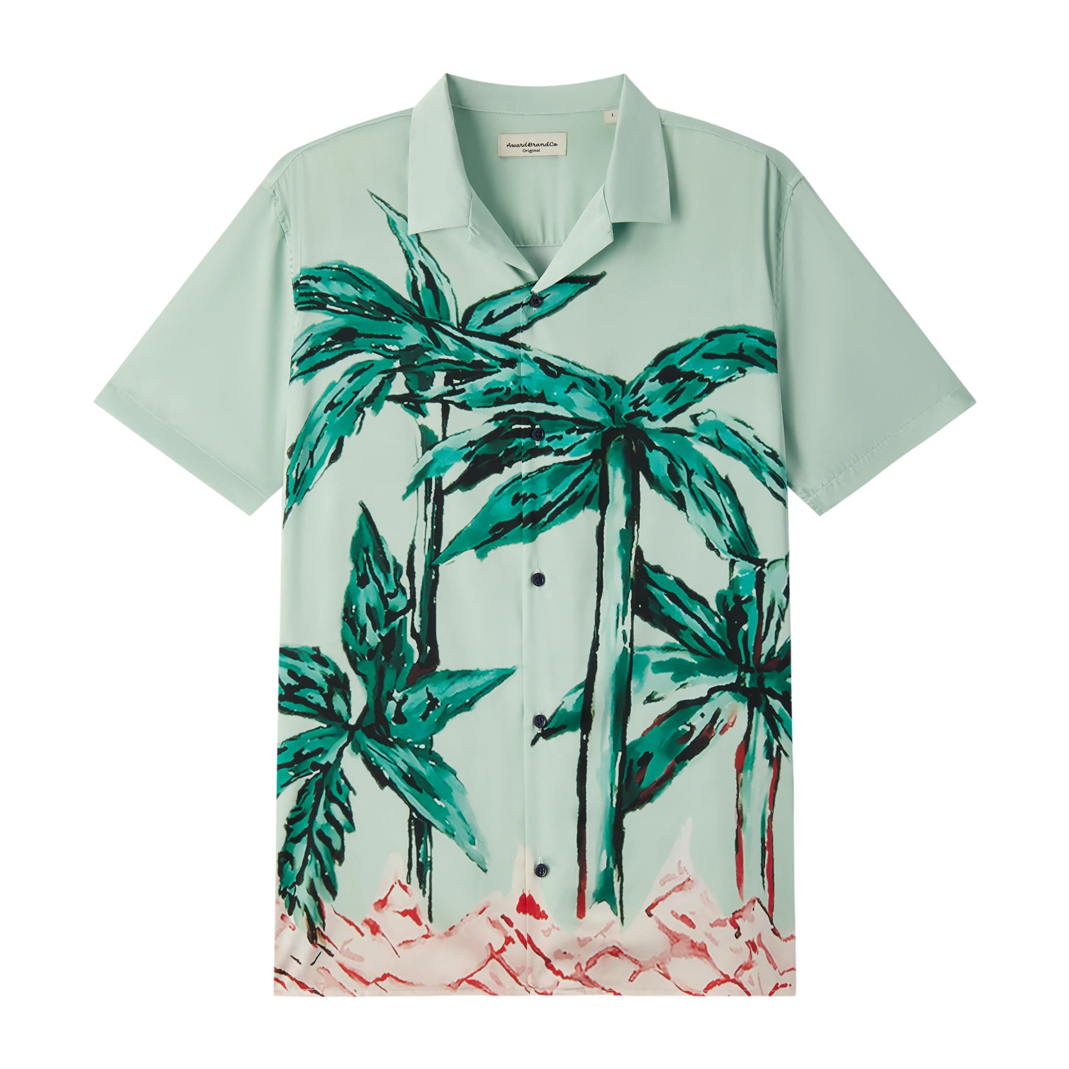 Waves of Creativity: Mint-Toned Hawaiian Shirt Dive into the essence of freedom and self-expression with this mint-toned Hawaiian shirt. Designed with undulating wave patterns that evoke the serenity of flowing water, this shirt radiates a cool and breezy summer vibe. The front features a minimal printed detail for an artistic touch, while the back showcases bold, hand-painted-inspired graphic elements—crossed oars and lush leaves, symbolizing adventure, nature, and movement.